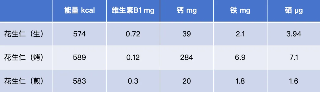 从数据可以看出,无论哪种烹调方式,花生的热量差别不大。而加热后,维生素B1 等水溶性维生素有一定的损失。不过,烤花生仁的矿物质都有大幅度提升,而煎炸的则有一定损失,可能是因为一部分矿物质溶解在油里造成的损失。